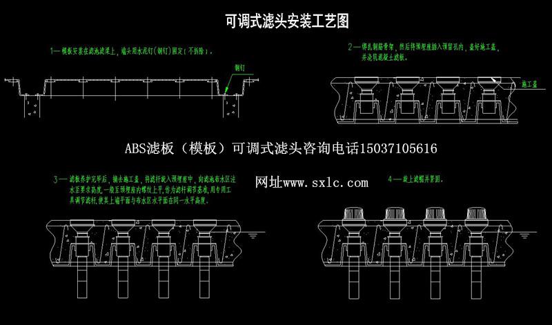 水廠濾池氣水反沖洗濾池常用的濾板有預制濾板和現澆整體濾板兩種:濾頭分為固定式和可調式兩種.固定式適應于預制濾板:可調式長柄濾頭特別適應于現澆濾板.也適應于預制濾板.QSK-ll型可調式長柄濾頭原料采用高強度ABS顆粒樹脂(簡稱ABS工程塑料)經高溫熱溶由精密磨具成型?烧{式濾頭主要用:濾帽、濾桿、預埋座組成,濾桿上設有調節螺紋,可供上下調節;且設有調節瓣與預埋座內調節瓣防脫條結合,可控制濾桿調節精度,同時固定其位置。